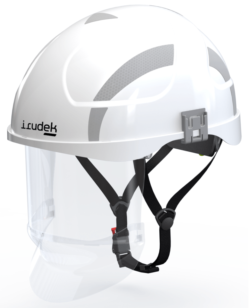 Capacete com viseira integrada com proteção contra arco elétrico.