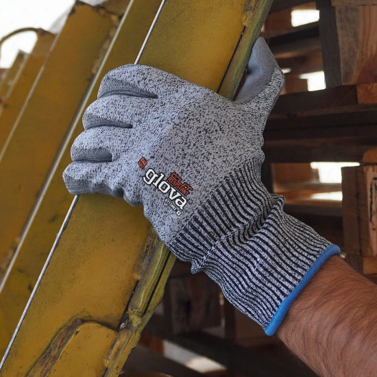 Revestimento a poliuretano cinzento na palma e ponta dos dedos.