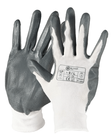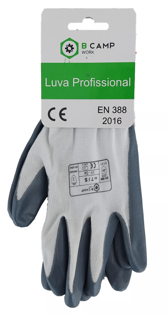 Luva em malha parcialmente revestida a nitrilo de longa duração.