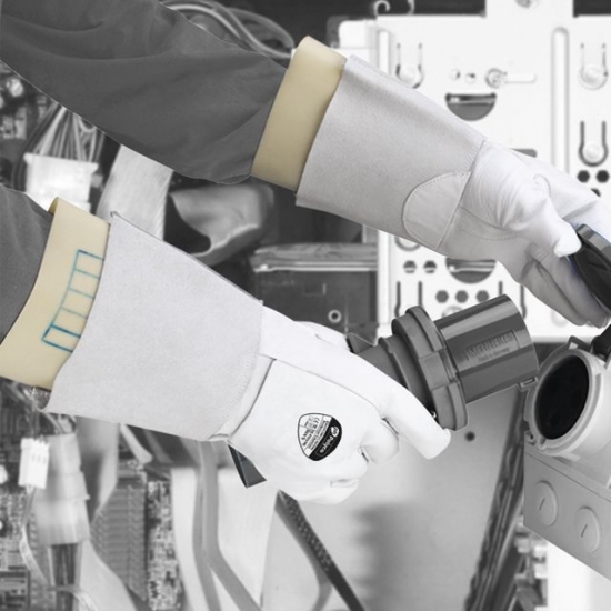Luva de couro concebida para ser usada sobre luvas de eletricista.