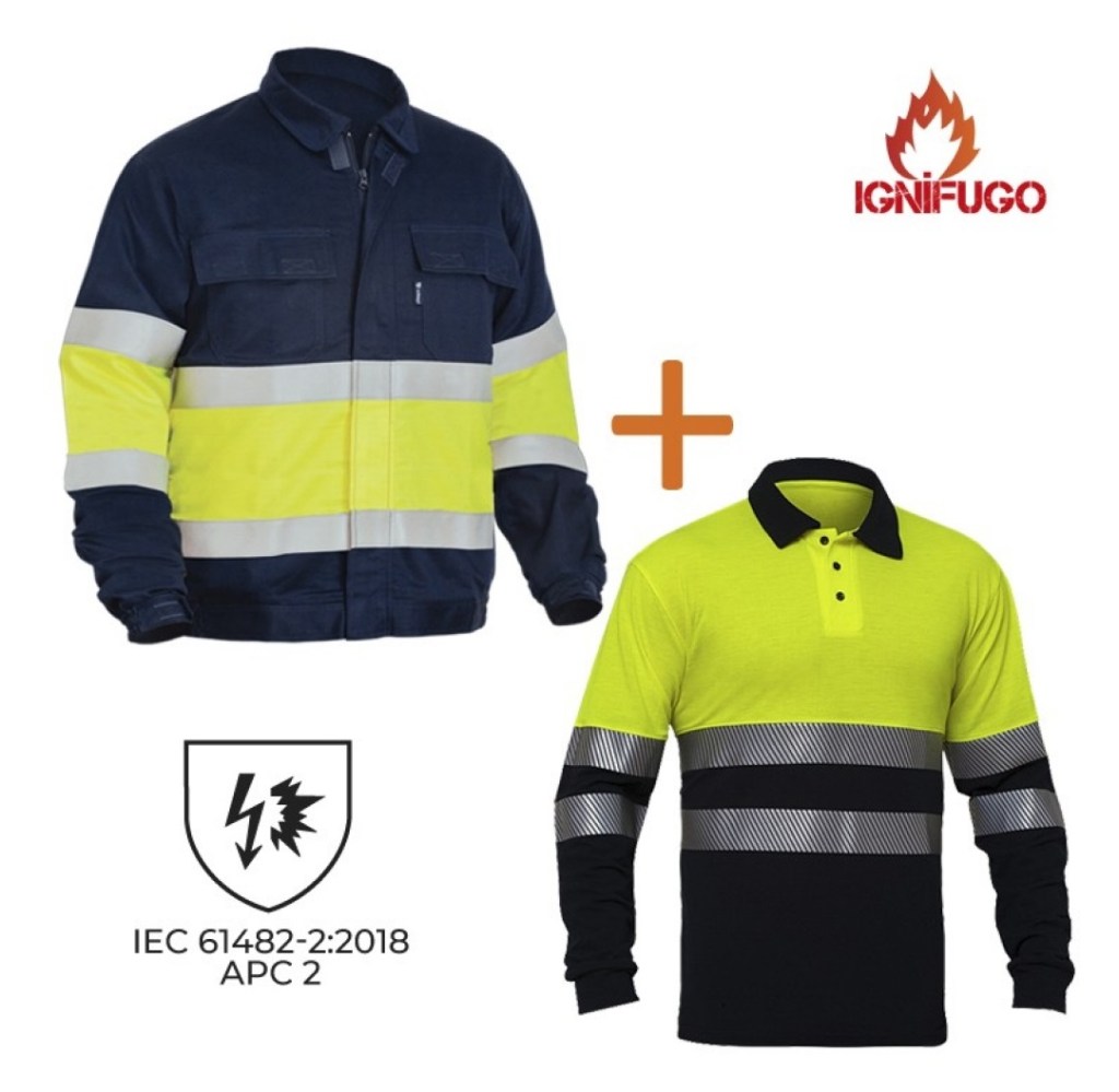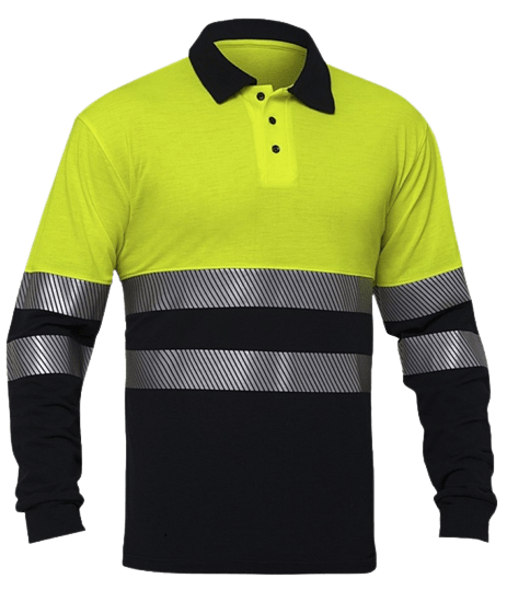 Polo ignífugo alta visibilidade com bandas refletoras.